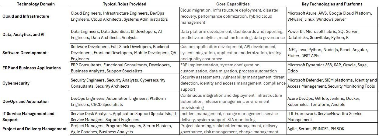 We provide skilled professionals across the full technology landscape, covering modern cloud platforms, enterprise systems, data and AI, software development, and cybersecurity. Our resources are experienced across leading technologies and frameworks, enabling rapid deployment and seamless integration into your teams.